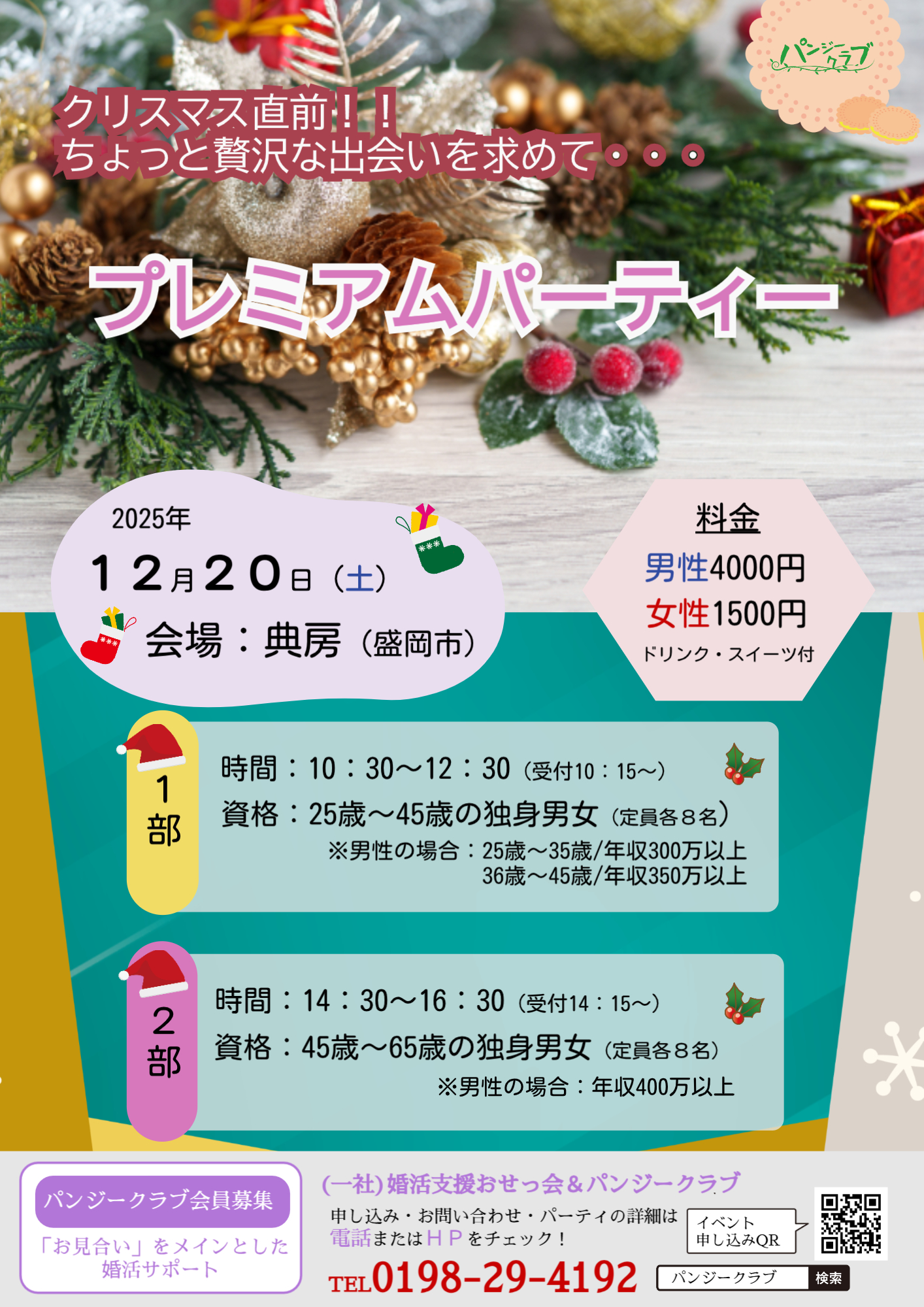 パーティーの内容 男性に年収の参加条件が付いたプレミアムなイベントです。 クリスマス直前、ちょっと贅沢な出会いをしてみませんか? ドリンク・スイーツ付き少人数でカフェタイムを楽しみながらゆっくりお話ししましょう。 お気軽にご参加ください。